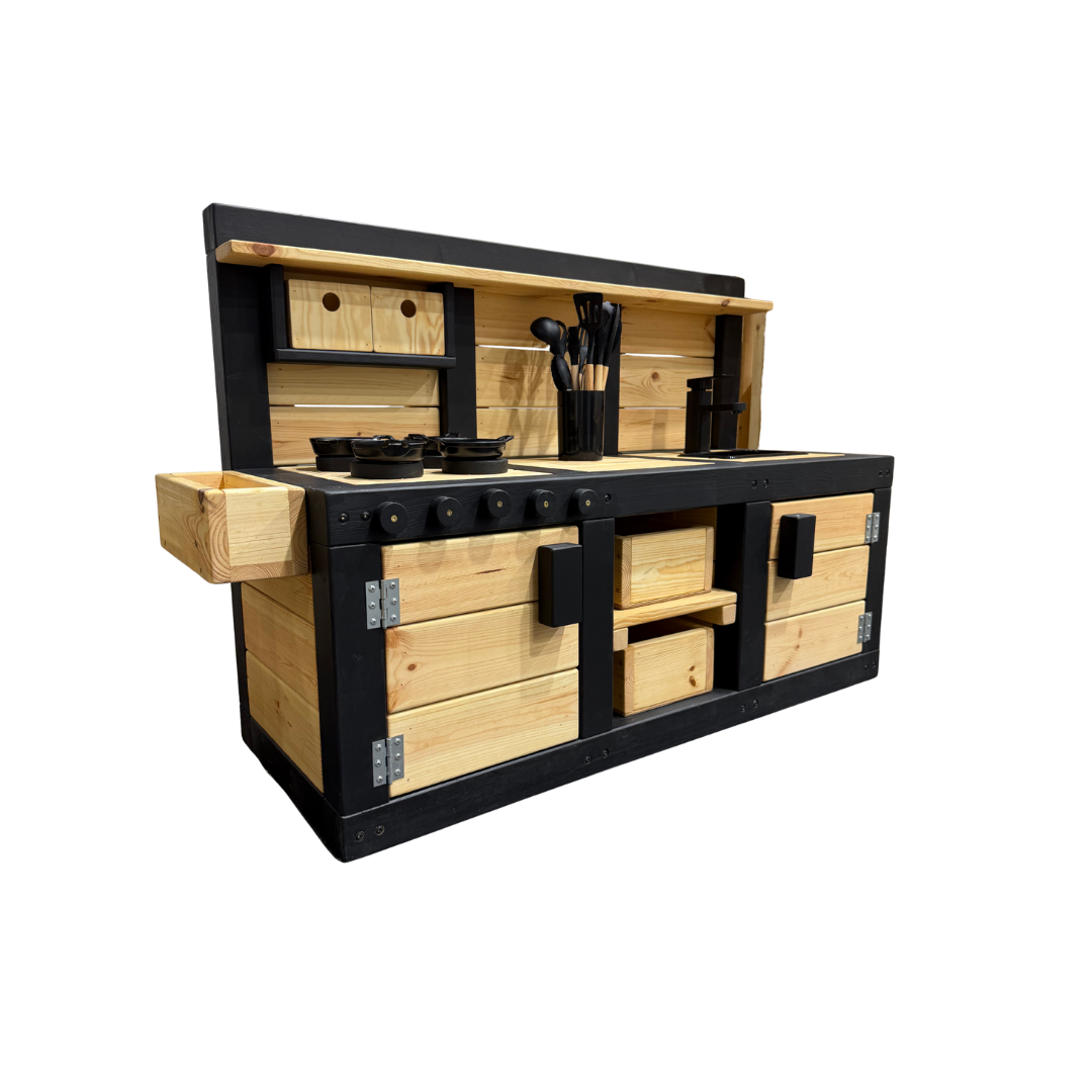 The kitchen includes a side box for accessories, 2 upper drawers, and 2 storage boxes. These additions allow children to easily store dishes, kitchen tools, and natural treasures from the garden.
