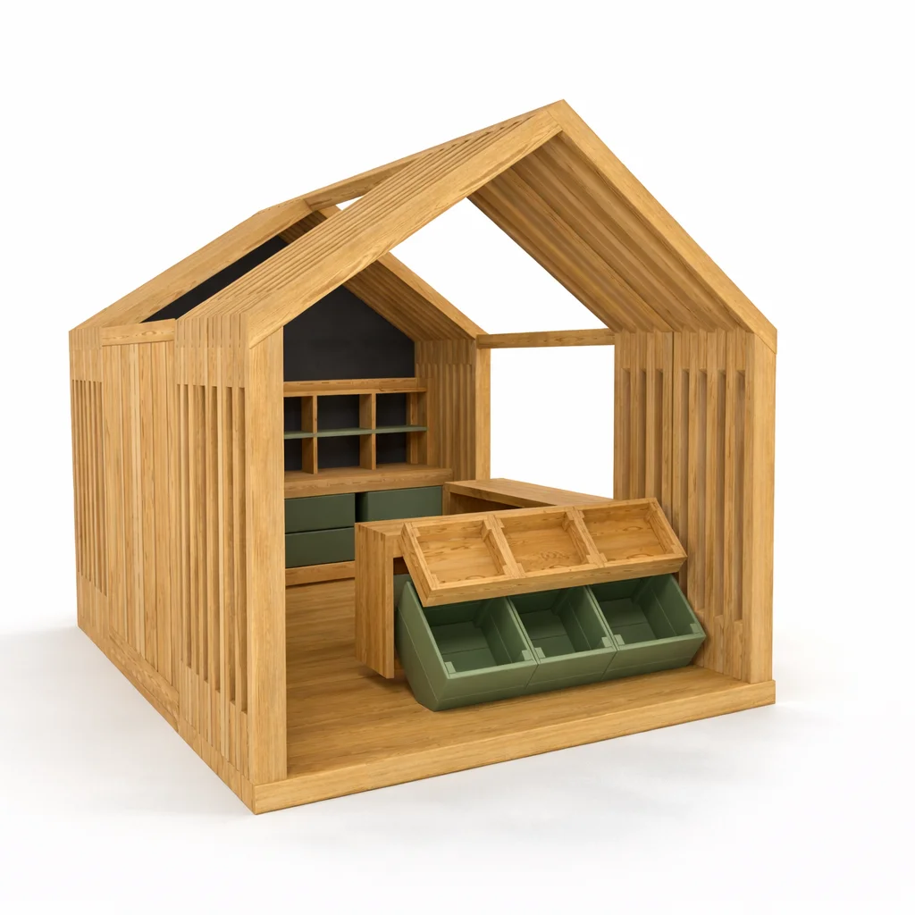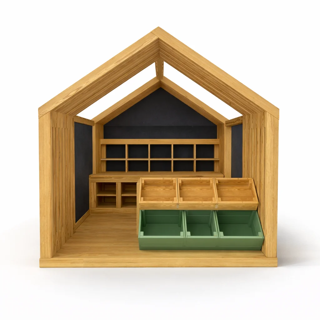 Domek XXL „Sklep” od MODULAKI to naturalna przestrzeń edukacyjnej zabawy. Drewniany market z półkami i skrzyniami rozwija kreatywność, samodzielność i współpracę.
