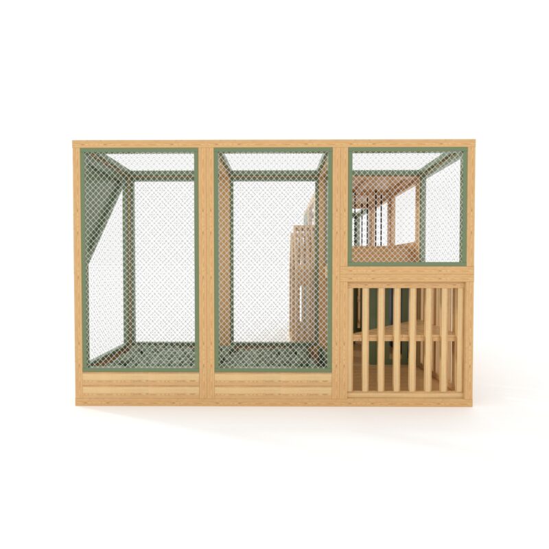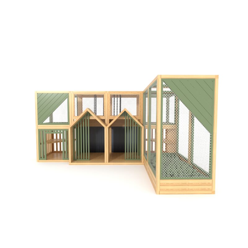 W skład zestawu wchodzi kompletny plac zabaw: konstrukcja drewniana, liny, tablice kredowe, beżowe siatki zabezpieczające.