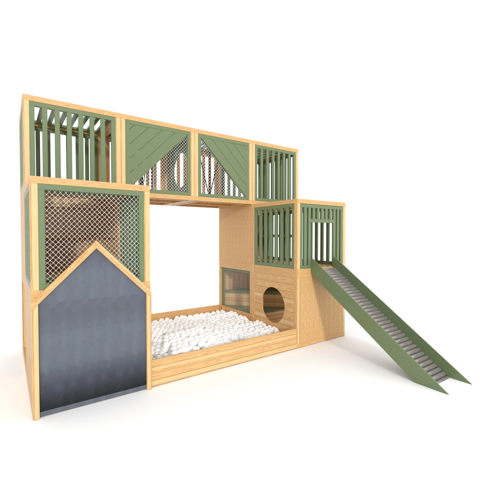 W skład zestawu wchodzi kompletny plac zabaw: konstrukcja drewniana, zjeżdżalnia rolkowa, tablica kredowa,